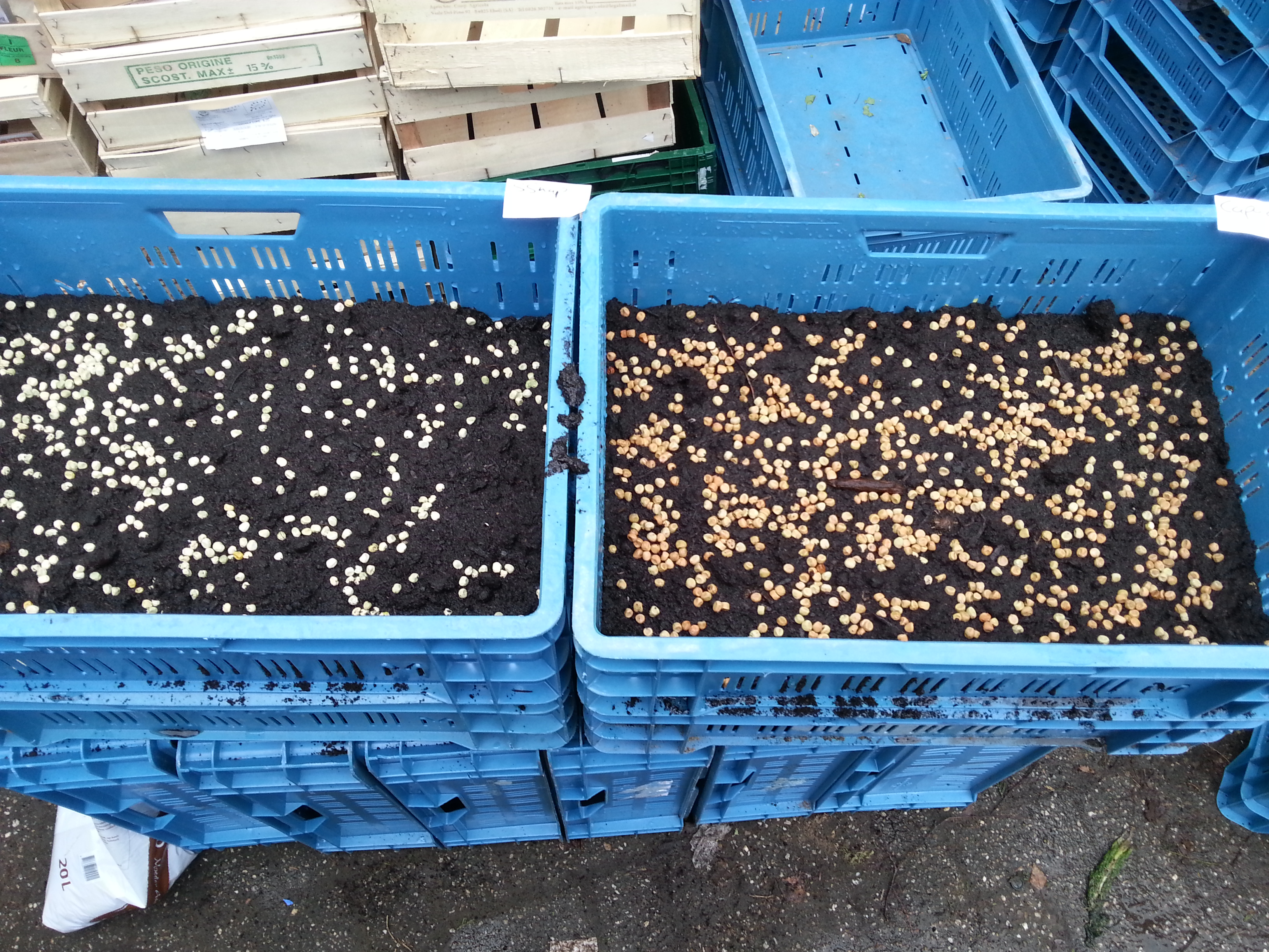 Het seizoen is begonnen! Nou ja, een beetje dan. We hebben de eerste gewassen gezaaid. We spelen altijd een beetje vals. Wij zaaien de eerste vroege peulen, capucijners, sugar snaps en dopewten bij Jonkers in de kas. Daar staan ze net naast de tomaten in het ketelhuis. Daar is het constant een graadje of 20. De planten vliegen er dan uit. Na een dag of 10 gaan ze naar buiten om te wennen aan een wat minder lux leven. Maar daar kunnen ze prima tegen! Over een week gaan de tuinbonen dezelfde kant op.